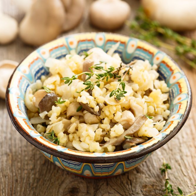 À parte, desfazer o caldo de legumes em 1 xícara e meia de água fervente. De seguida, juntar ao trigo e deixar cozinhar muito lentamente.